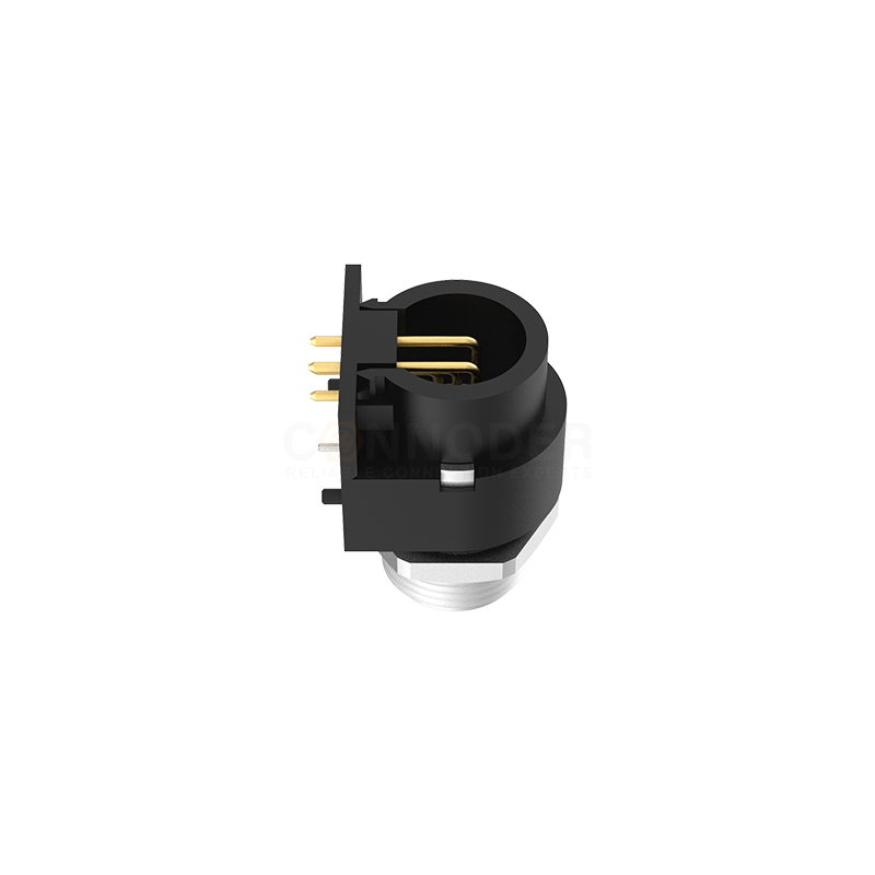 M12A coded panel flange seat curved pin connector is a connector designed specifically for the field of factory automation, with the design standard of IEC 61076-2-101. This type of connector is mainly used to connect sensors and actuators.